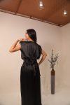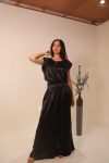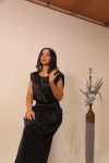 Turn heads with this premium black satin cord set, featuring a stylish back-open top with padded shoulders and ultra-comfortable elastic-band pants.