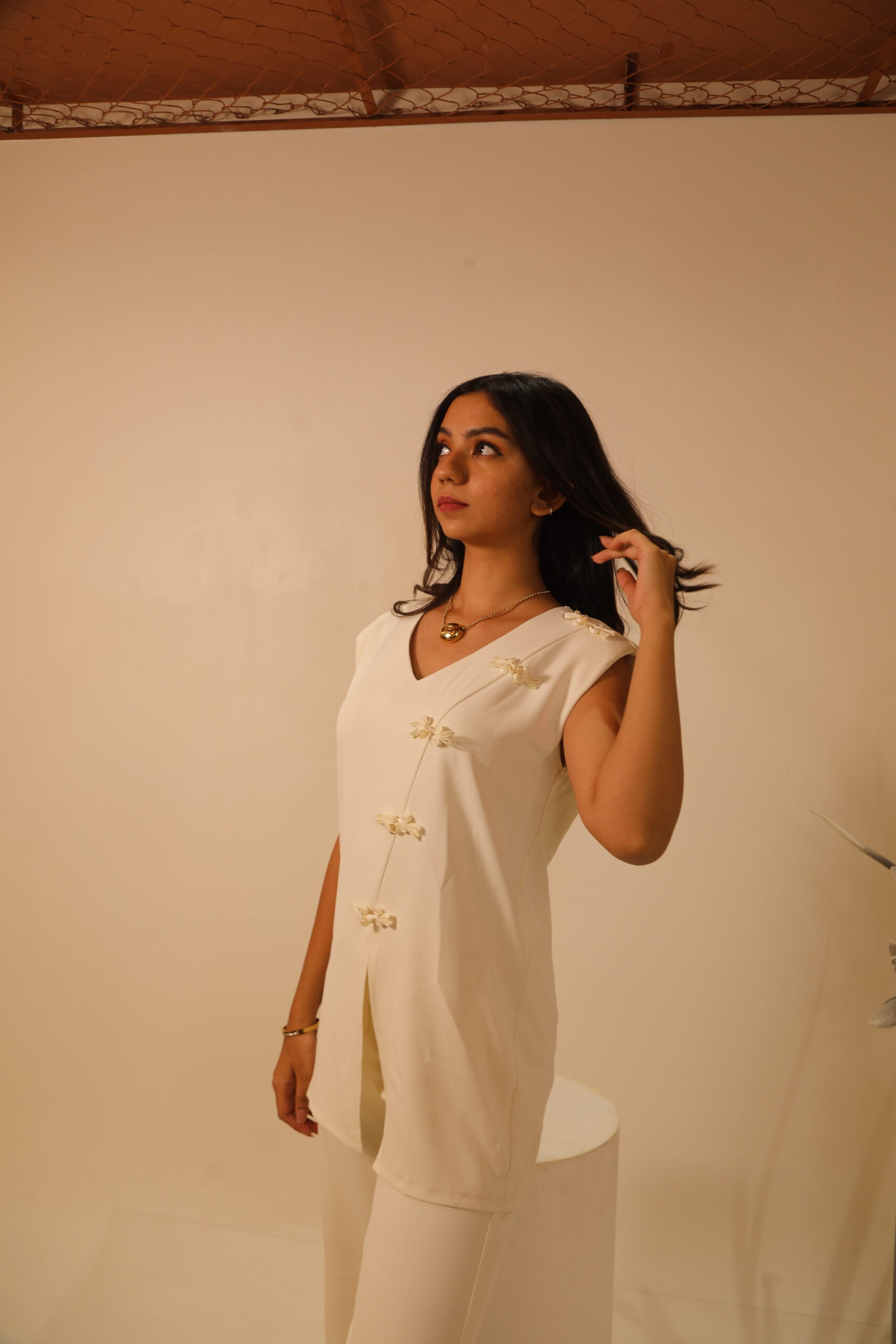 Elevate your style with this elegant cream co-ord set, featuring a structured top with floral button details and padded shoulders, paired with mid-rise trousers for a flattering fit. Perfect for work, casual outings, or special occasions.